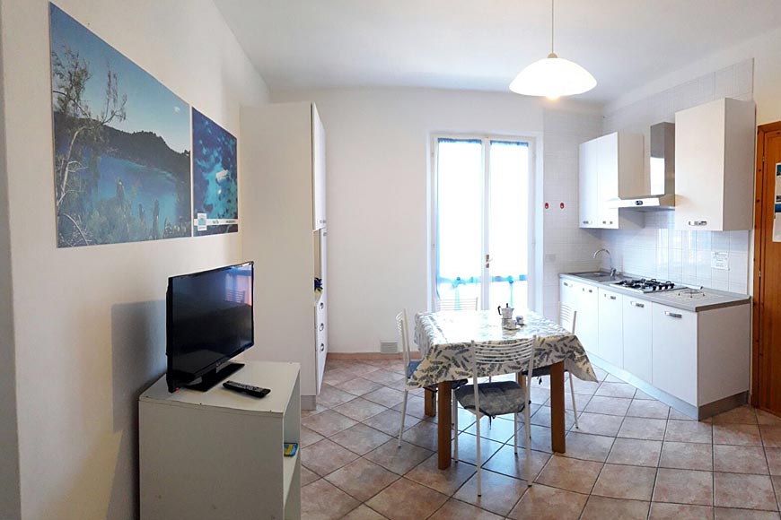 I trilocali 6/7 posti letto sono appartamenti al primo piano composti da soggiorno/cucina con con divano letto a cassetto, camera matrimoniale, camera doppia e bagno con box doccia.